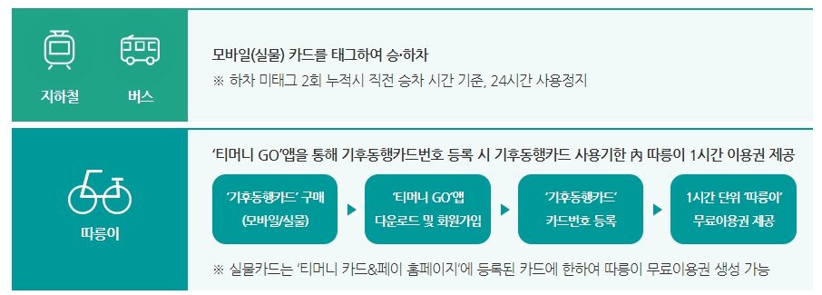 서울시 기후동행카드는 사용개시일로부터 30일간 사용이 가능하며, 실물 카드 또는 모바일 카드를 태그 하여 승, 하차하면 됩니다. 따릉이를 탑승하실 때는 티머니 GO앱에 기후동행카드 번호를 등록하신 뒤 기후동행카드 사용기한 동안 따릉이 1시간 이용권을 사용하시면 됩니다.